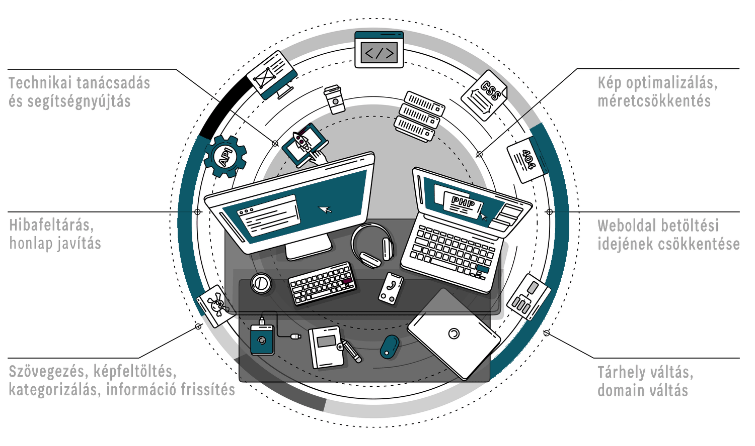 Választható teljes körű üzemeltetés vagy karbantartás. Minden esetben folyamatosan ellenőrizve és frissítve vannak a weboldalak, hogy ezzel megelőzzük a hibákat, a sebezhetőségeket, és ezzel biztosítom a weboldal stabilitását és teljesítményét.